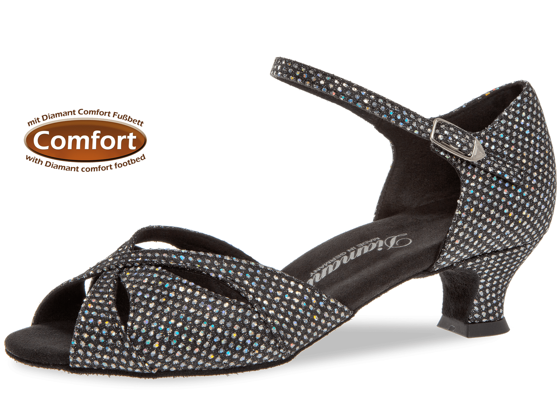 Mod. 144 Diamant Damen Latein Tanzschuhe Made in Germany handgefertigt mit einem Vorderblatt aus zwei übereinander liegenden Flügeln die sich dem Fuß anpassen. Die zehenoffene Sandalette wird mit einer stufenlos einstellbaren Druckknopfschnalle zum schnellen Öffnen und Schließen an einem Fersenriemchen gefertigt. Dieser Tanzschuh wird in der Weite F (Normalweite) mit Diamant Comfort Fußbett und einem standfesten 4,2 cm Spanish Absatz mit großer Auftrittsfläche hergestellt. Als Innenauskleidung wird ein atmungsaktives und Feuchtigkeit absorbierendes Microfaser aus italienischer Premium-Herstellung eingearbeitet. Für das Obermaterial aus schwarz-silber Hologramm wird ein hochwertiger Stoff besetzt mit funkelnden Pailletten aus England verwendet.